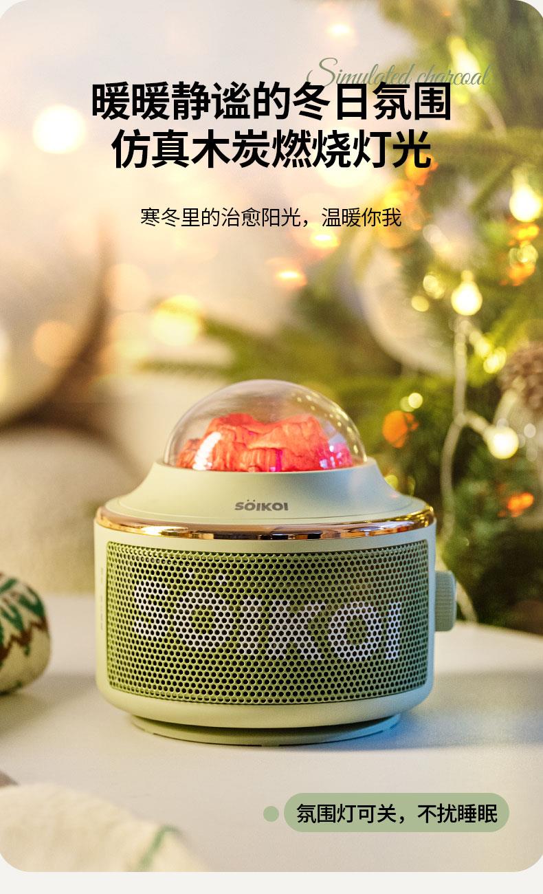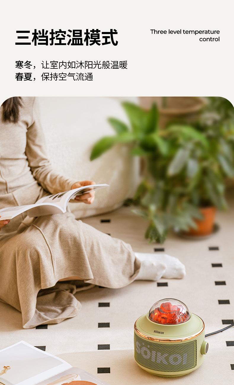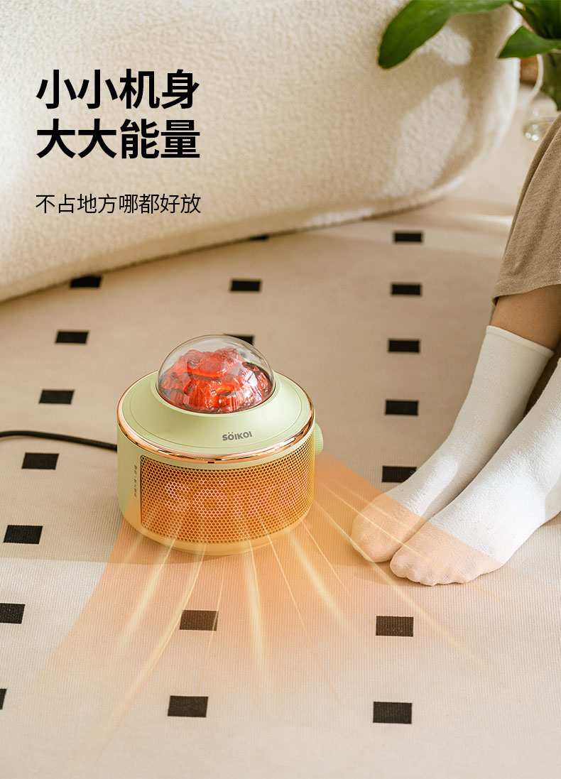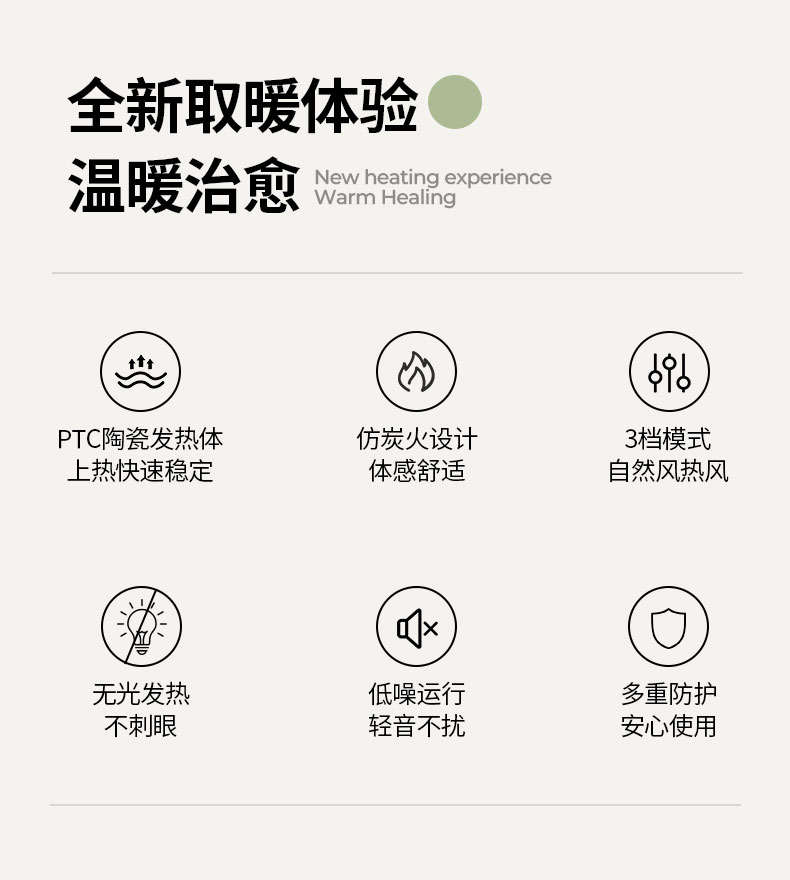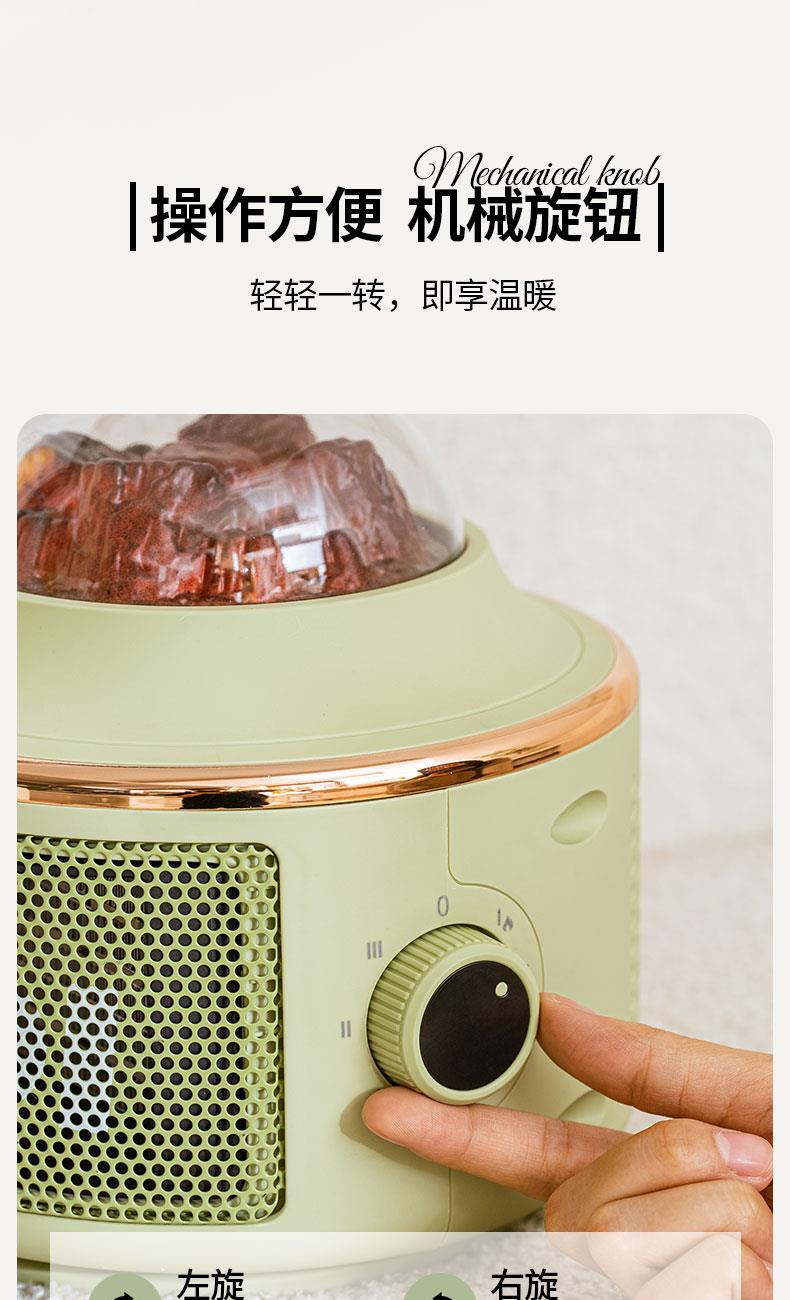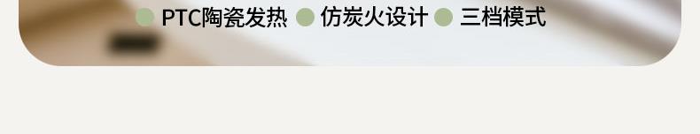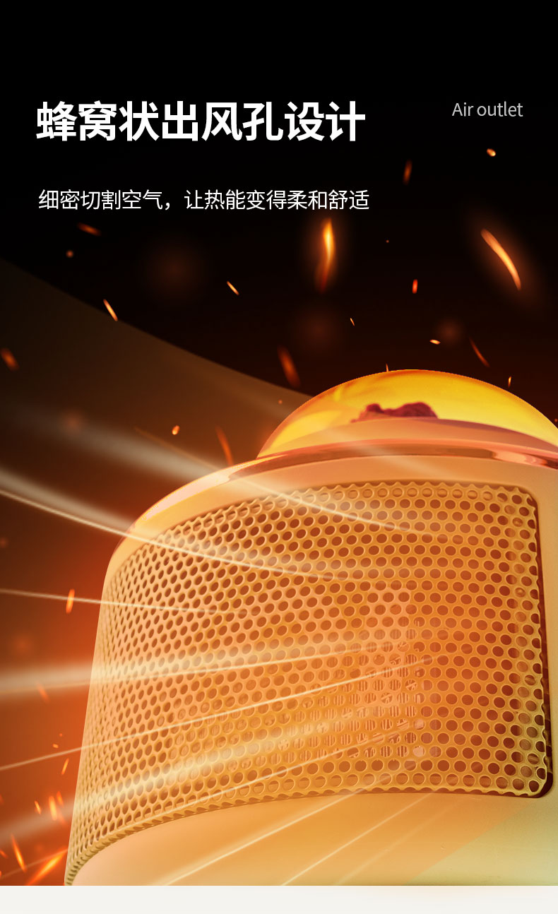 產(chǎn)品特點(diǎn) PTC陶瓷發(fā)熱 | 仿炭火設(shè)計(jì)| 三檔調(diào)溫模式 1、PTC陶瓷發(fā)熱體,高效釋放熱能,讓房間快速升溫 蜂窩狀出風(fēng)孔設(shè)計(jì),細(xì)密切割空氣,讓熱能變得柔和舒適 2、仿真木炭燃燒氛圍燈設(shè)計(jì) *氛圍燈可關(guān),不擾睡眠 3、三檔控溫模式 一檔自然風(fēng)10W、二檔暖風(fēng)900W、三檔熱風(fēng)1500W 4、 安全防護(hù):過熱保護(hù)、傾倒斷電、防燙保護(hù) 5、加厚機(jī)身,防燙材質(zhì),寵物誤碰也沒事 細(xì)磨砂表面處理,手感好(如嬰兒膚感) 6、操作方便,機(jī)械旋鈕 左旋:無燈/三檔;右旋氛圍燈/三檔