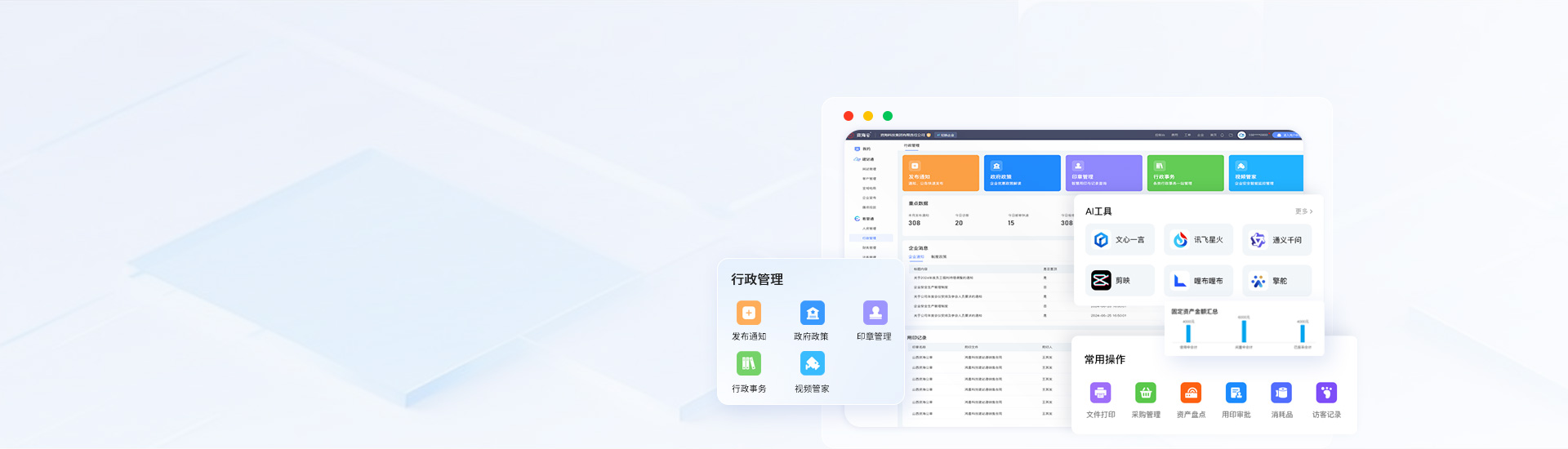 行政管理系統(tǒng)涵蓋信息發(fā)布、政策導(dǎo)航、行政事務(wù)、資產(chǎn)管理、運營分析等功能,同時推出智能印章、視頻管家等智能硬件,軟硬件結(jié)合,提升企業(yè)管理效率、為企業(yè)實現(xiàn)降本增效。